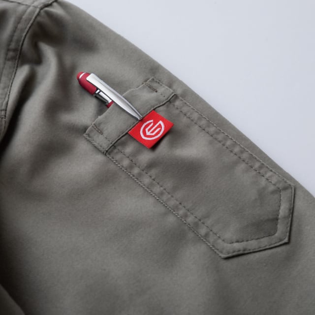 マジックテープ/胸ポケット・袖口・ウエストコイルファスナー/前立て・ヒップオープン樹脂ボタン/ウエストアジャスター